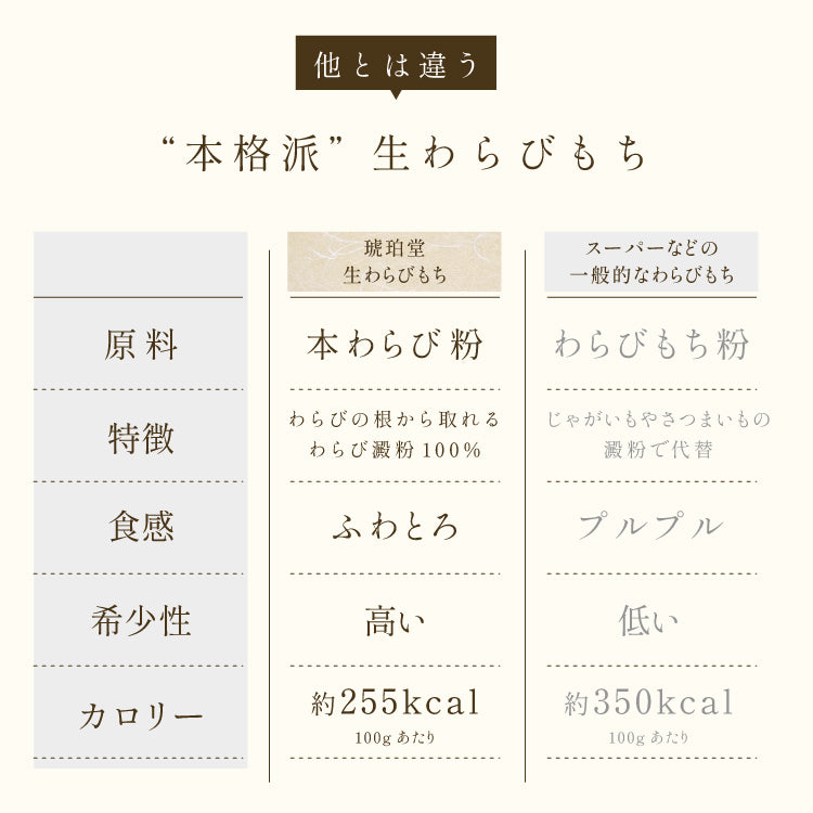 【わらび餅】砂糖(国内製造) / 大豆、麦芽糖 / タピオカでん粉 / 本わらび粉 / れんこんでん粉 / アルロース