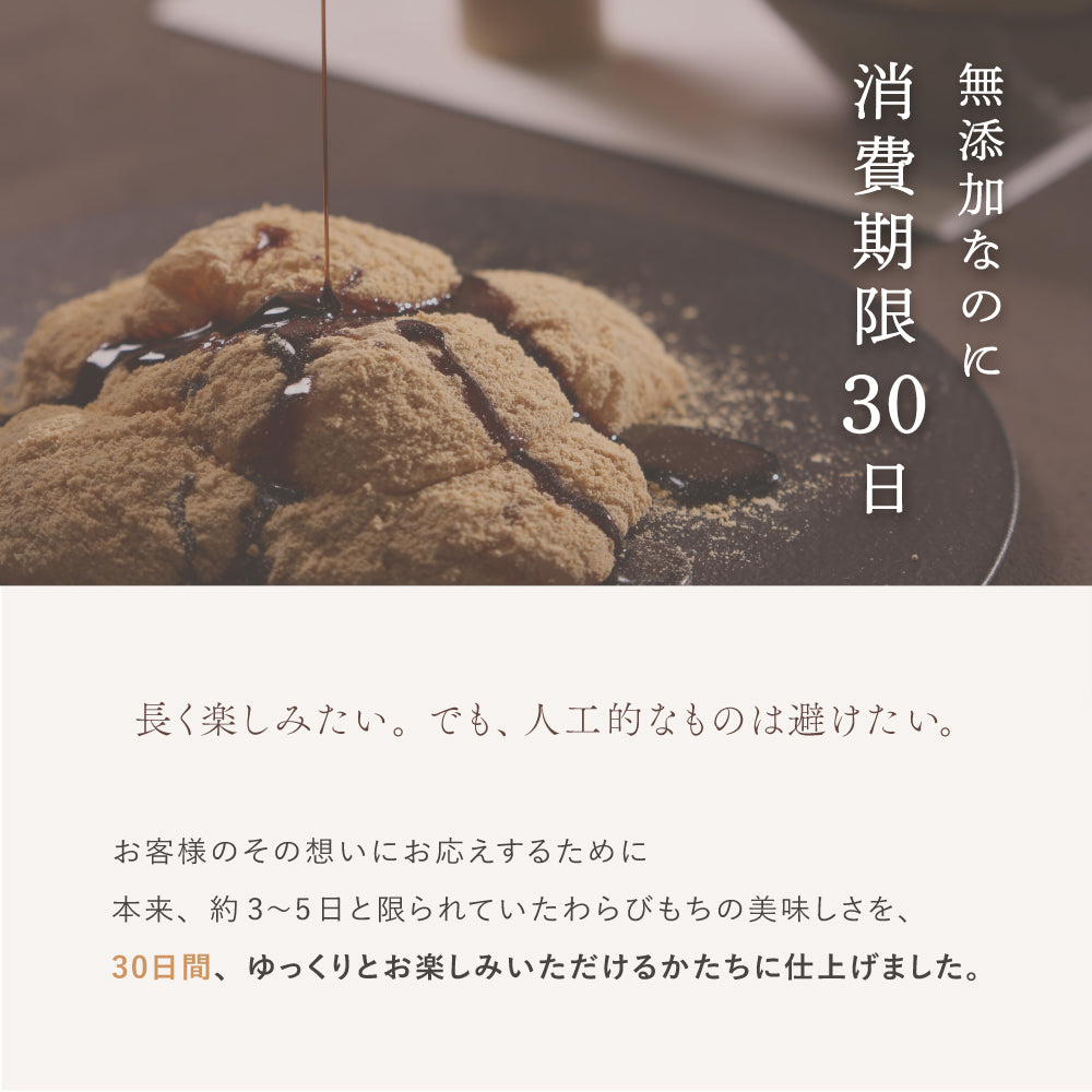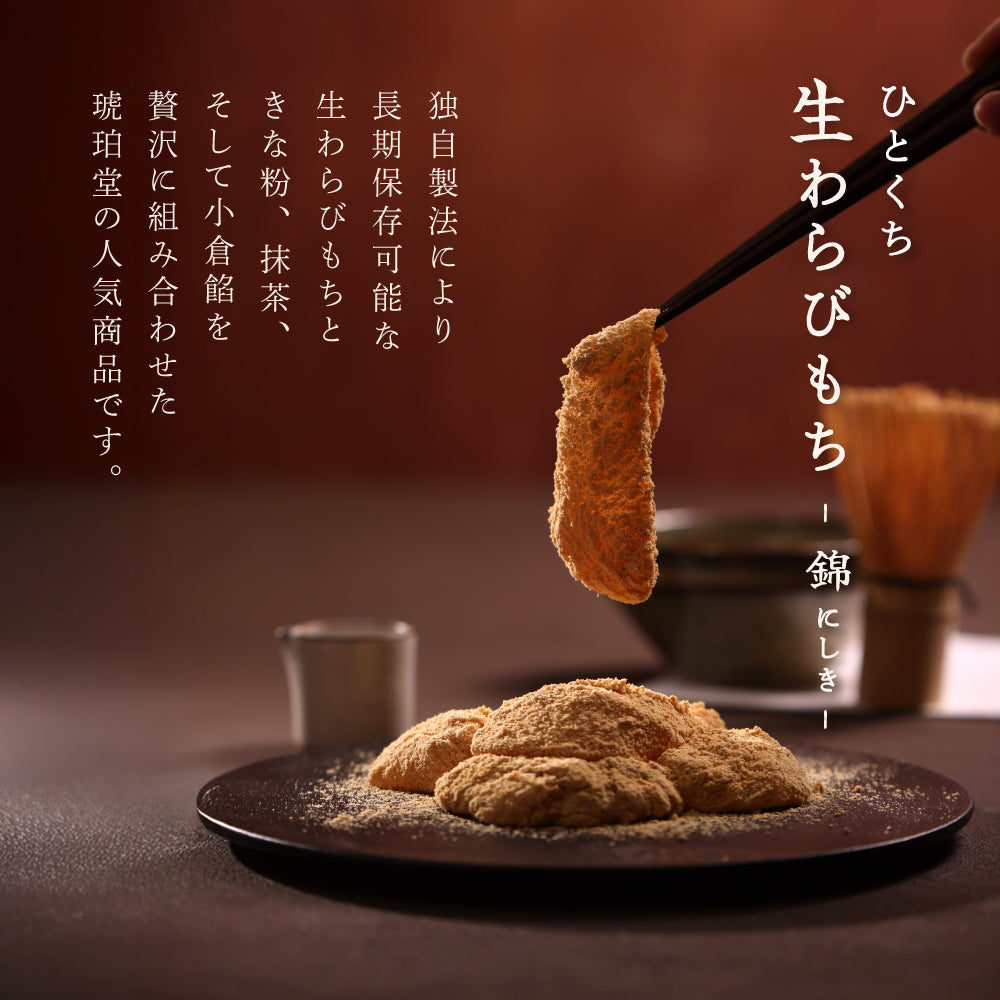 長期保存可能な生わらびもちと、抹茶、小倉餡を贅沢に組み合わせました。