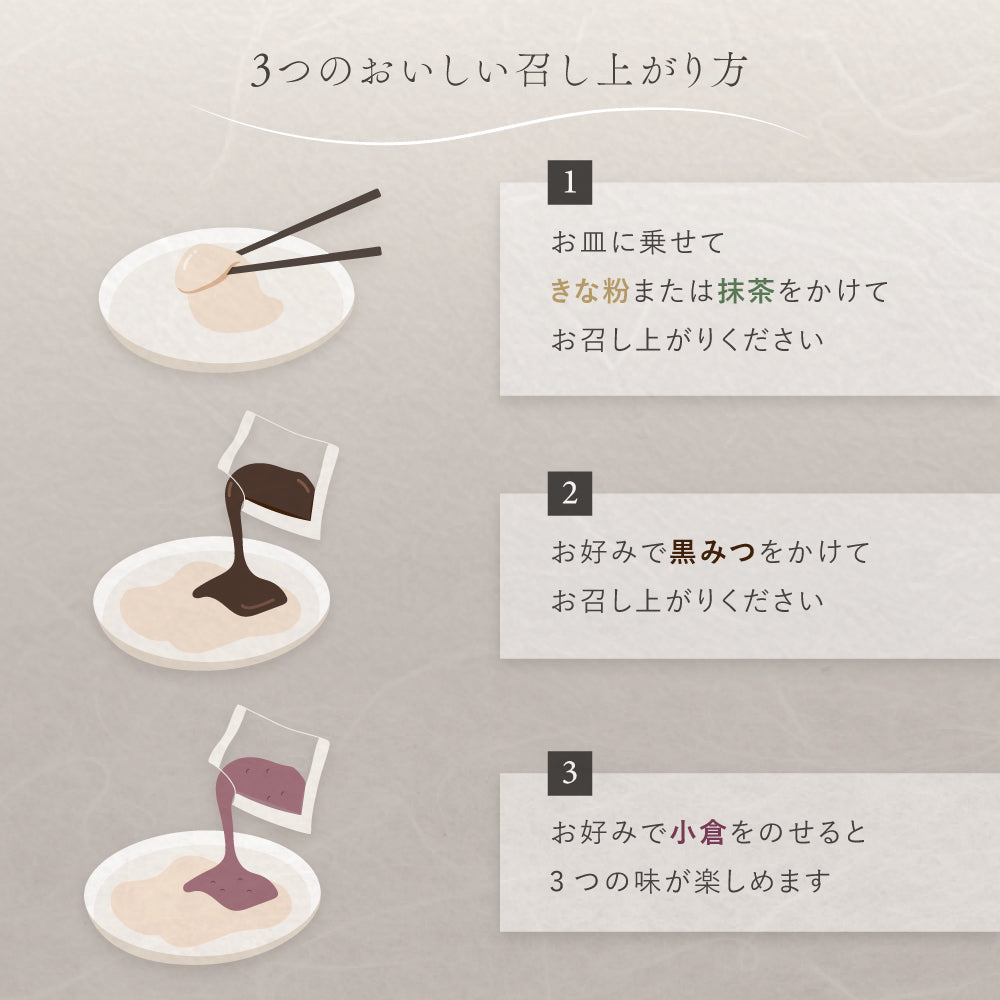 わらび餅×2パック / 抹茶きなこ×2袋 / あん×1袋 / 黒蜜×1袋